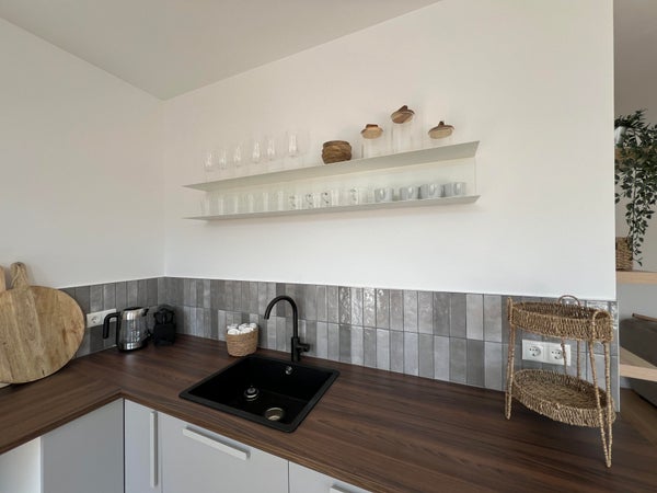 Eenvoudige keuken staat in directe verbinding met de woonkamer.